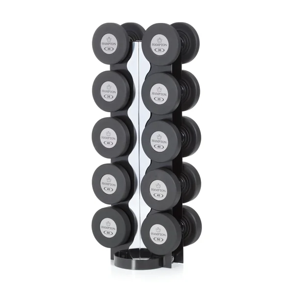 Our vertical dumbbell racks are the optimal space-savers! We have an assortment of styles to choose from. The small footprints make them ideal for use in limited-space environments. We offer 2-sided and 4-sided designs, as well as our unique five-pair Twin Tower rack (V-TT-5). Depending upon your special needs and budget, there’s a good chance that we have a rack for you.