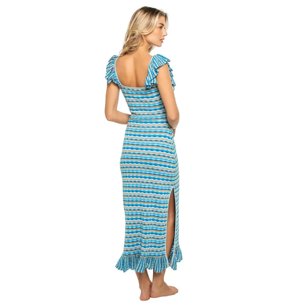 Knit midi dress features a square neckline with ruffle detailing, side slit and ruffle hem.