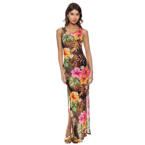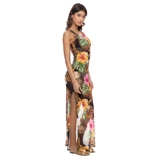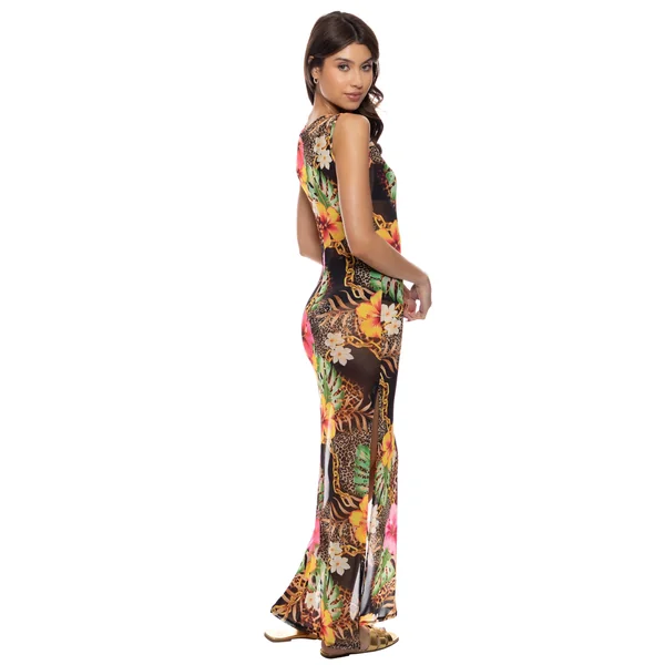 Mesh maxi dress features mixed tropical animal print, scoop neckline, and high side slits.