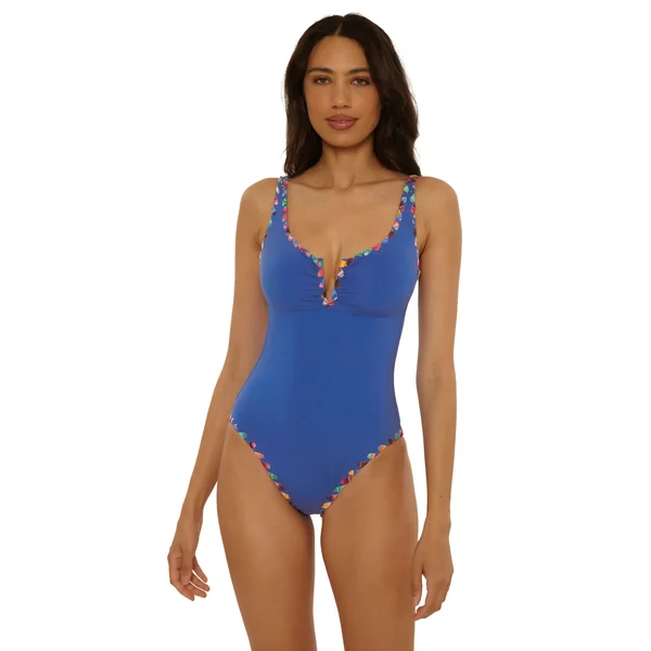Viviana one piece features hand looped Bali printed binding and a v-wire front. Offers removable soft cups, adjustable over the shoulder straps, tie back closure, and moderate bottom coverage.