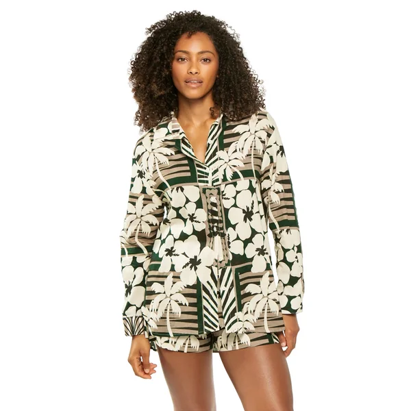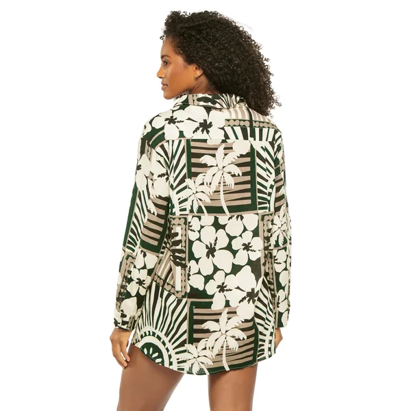Voile linen shirt features tropical print, long sleeves, collared neckline and button front.