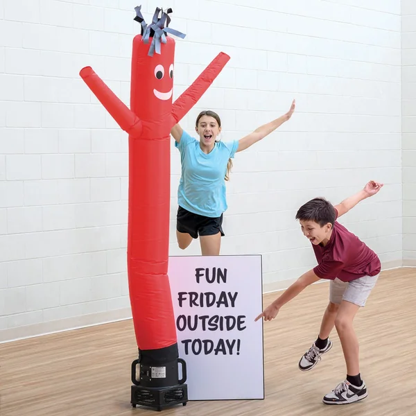 Immediately attract attention during class, fundraisers, and field days with an inflatable dancing tube person! Air Dancers consist of a red tube made of high-quality polyamide-nylon silk with fringed hair, a face, and 2 arms that attract attention as they dances. Attach it to the blower using hook-and-loop fasteners. Weather-resistant blower includes an 8’L cord and can be used indoors and out (store indoors). Quiet blower is made of long-lasting, commercial-grade components and is IP 44 rated.