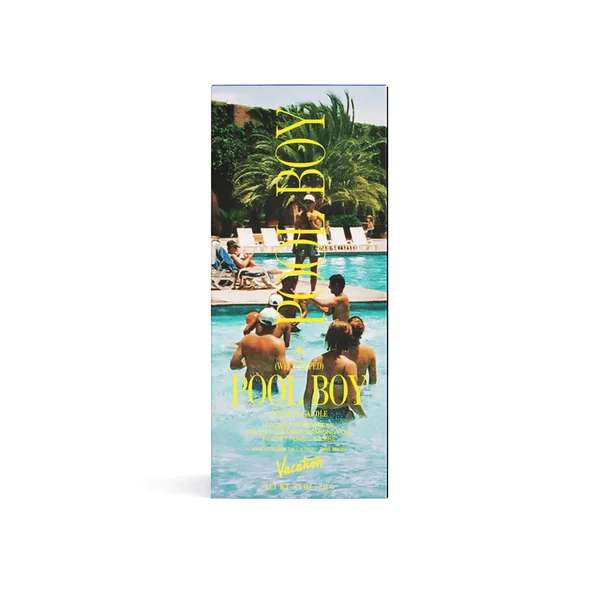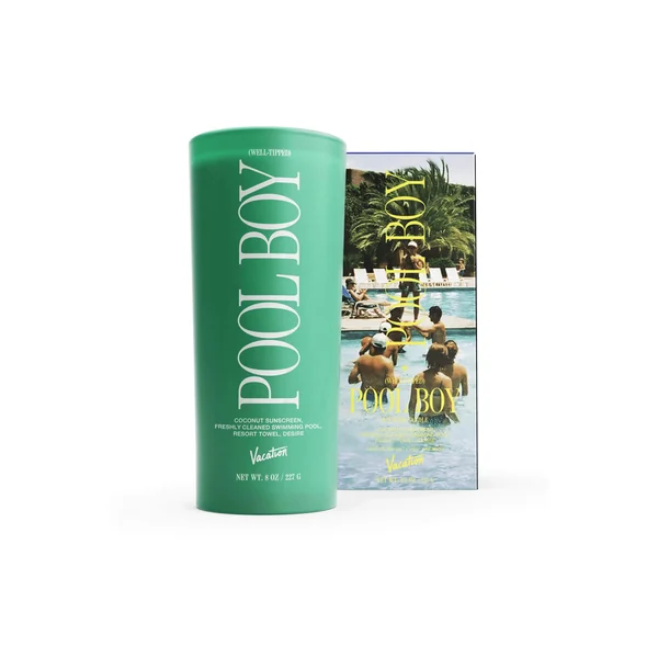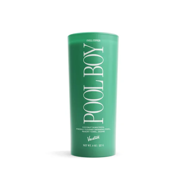 Candle features luxury, vegan, cruelty free soy wax that has a 65 hour burn time and the scent of coconut sunscreen, recently de-leafed swimming pool, resort towel, and desire.