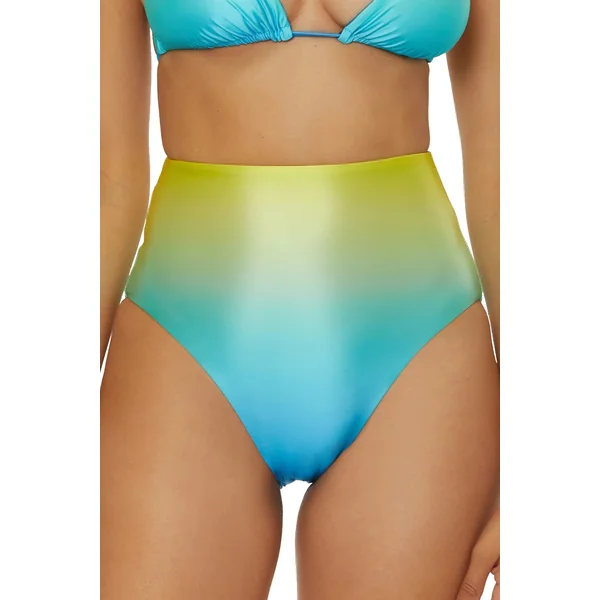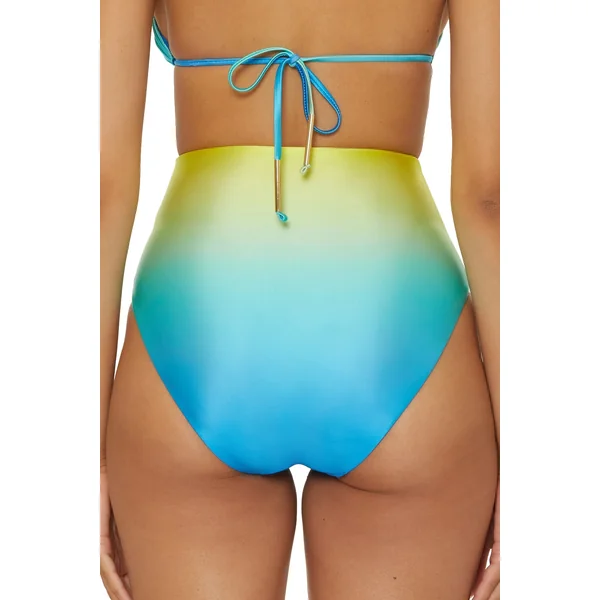 Bikini bottom features ombre high-shine liquid fabric that reverses to a solid and moderate bottom coverage.