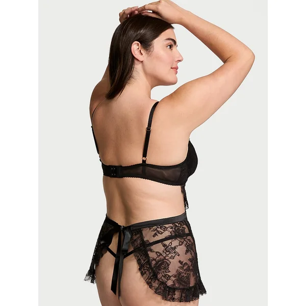This flirty apron style turns up the heat with our romantic rose lace topped with a bow. Secured with a satin sash in back and paired with the matching Thong Panty, it’s sheer perfection.
