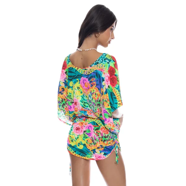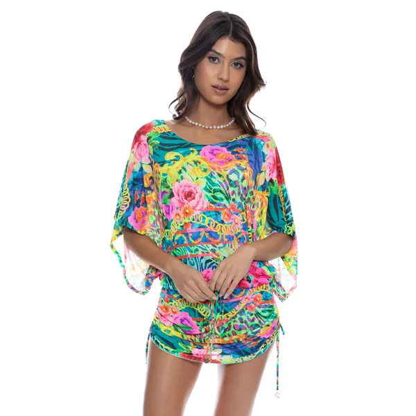 Wild blooms mini dress features a bright floral print, ties at sides to adjust the length and offers a drawstring waist.