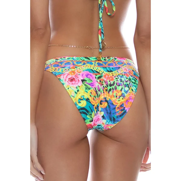 Reversible bikini bottom features gold ring accents, adjustable tie sides and minimal bottom coverage.