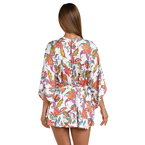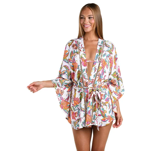 Kimono features colorful floral print, gold-plated bead trim detailing, three-quarter sleeves, and a removable waist tie.