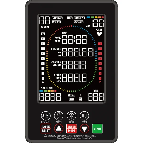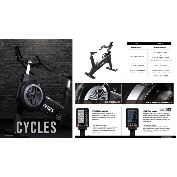 The Xebex Air Cycle includes a brightly-lit, color-coded LCD display that is the only display of its kind that indicates the damper level and the magnetic resistance level directly on the console. The display shows the Air Damper Resistance Level, AirPlus Resistance Level, Time, Distance, Calories, RPM, Watts, Speed, Pulse at all times, along with Calories/Hour when you switch modes. The easy-to-read console is designed for simplicity and the ability to know your progress at all times using a color-coded Progress Circle. The Progress Circle can be assigned to represent any distance, calorie, or time that you preset, or a 1000m lap by default. It also includes a color-coded display for Watts Output and Heart Rate Zone so you can track your intensity at a glance. Smart Connect ability allows you to connect to a variety of 3rd party apps found in our Smart Connect Ecosystem.
