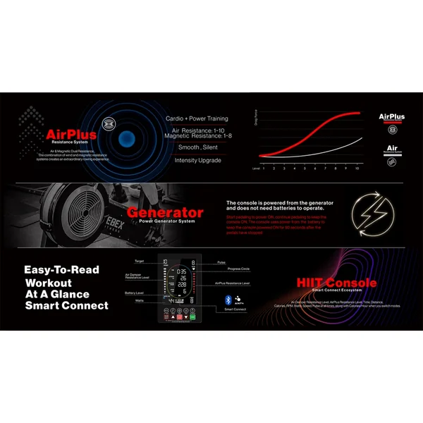 | CONSOLE | Bright-display multi-colored HIIT console displays air resistance level, AirPlus magnetic resistance level, Time, Distance, Calories, RPM, Watts, Speed, Pulse at all times. Color-coded Progress Circle, Watts Output, and Heart Rate Zone. Compatible with 5khz chest belts |