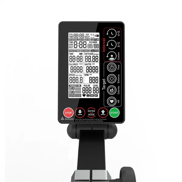 CONSOLE HIIT console displays various performance metrics: air resistance level, Time, Distance, Calories, RPM, Watts, Speed, Pulse. Compatible with 5khz chest belts