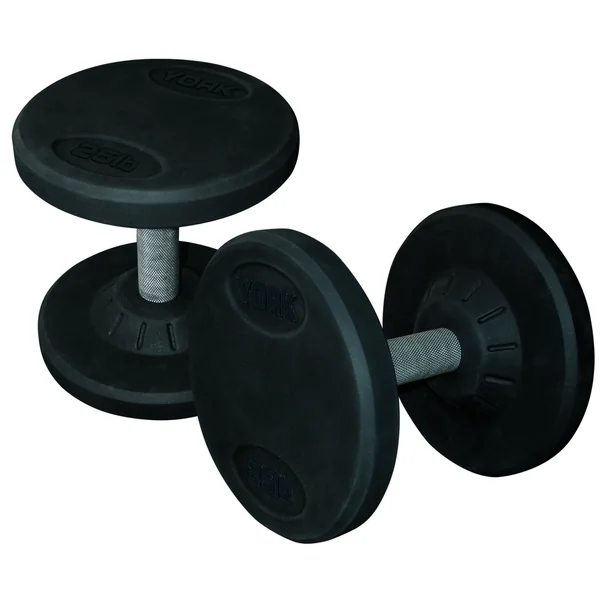 Perhaps one of the most ergonomically correct dumbbells on the market, York’s Pro Style Dumbbells feature a shortened fully knurled 30mm solid steel handle. The shorter handle results in less hand travel and optimum control of the dumbbells during exercise. The Pro Style Dumbbell heads are comprised of solid steel inserts fully encased in virgin rubber. The solid steel handle passes through the steel insert and is welded, permanently joining the head to the handle. The virgin rubber coating increases durability, protects flooring and equipment, enhances appearance, diminishes noise, and is easy to clean. Pro Style Dumbbell Sets are available in 5-50 lb., 55-100 lb., 105-125 lb., 130-150 lb.