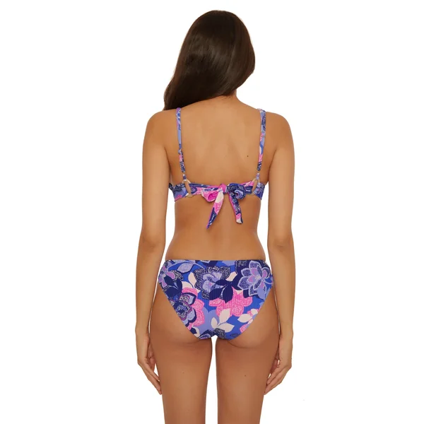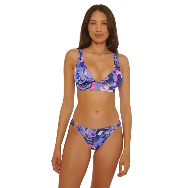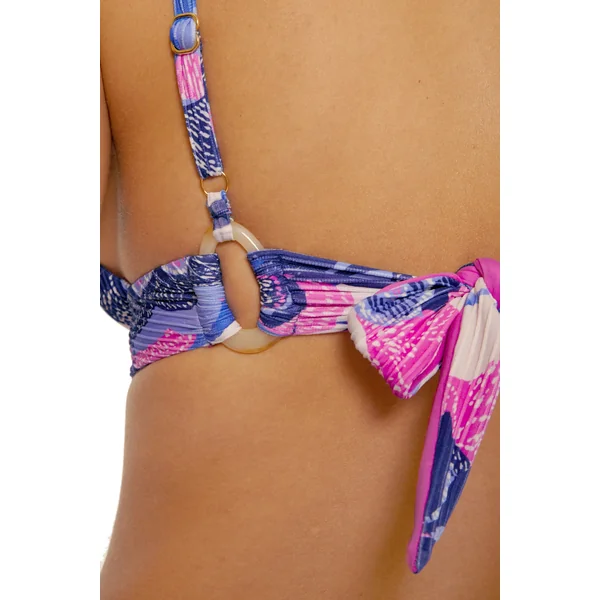 Rib textured bikini top features shimmer detailed floral print, shirred straps, and a tie back with ring accents. Offers removable soft cups and adjustable straps.