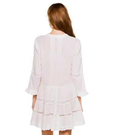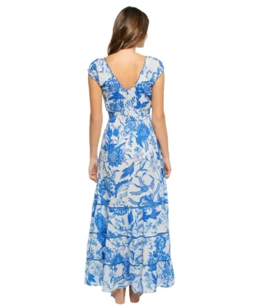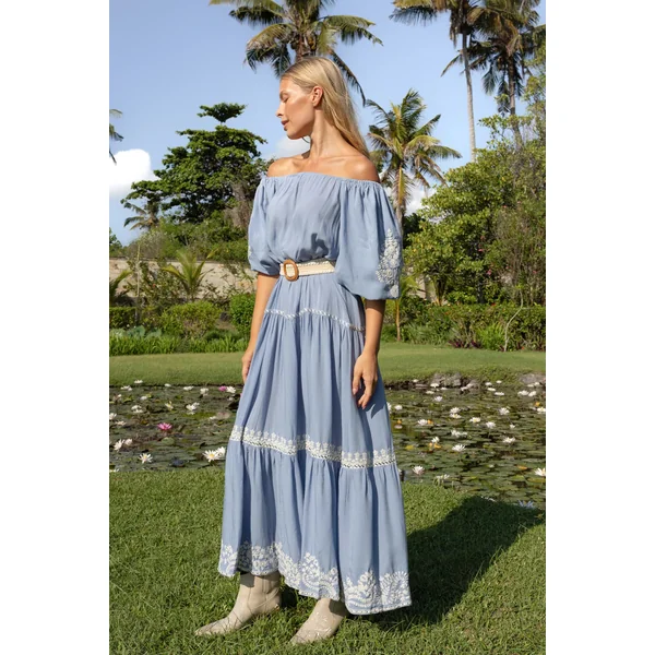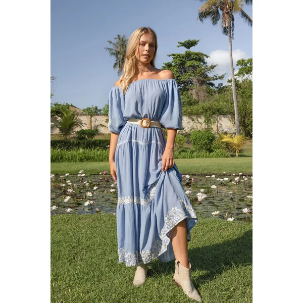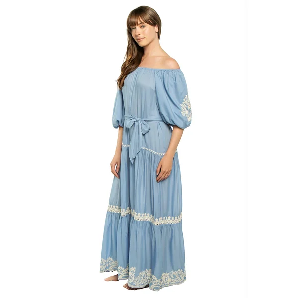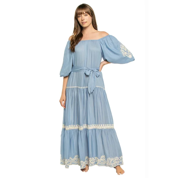 Embroidered Zaya maxi dress features off the shoulder design, puffy half sleeves and a flattering tie waist.