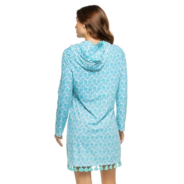 Tunic features demask print, tassel details, long sleeves, v-neckline, and hood.