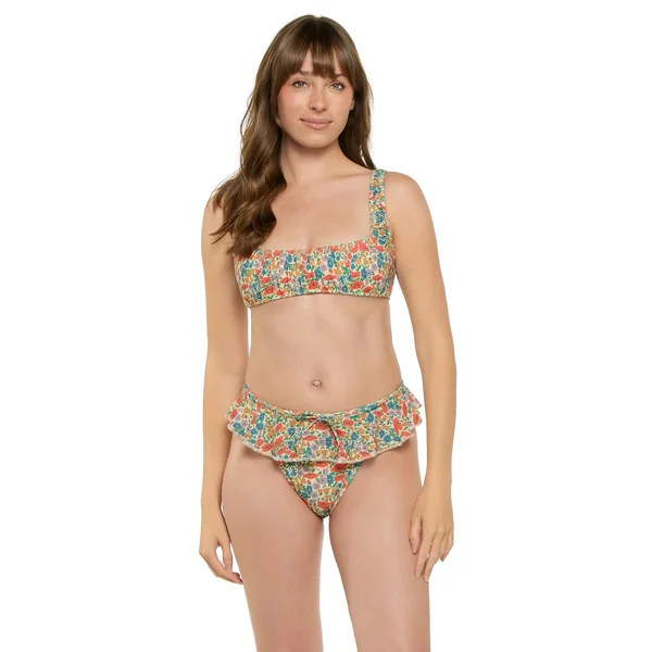 Bikini top features floral print, square neckline, ruched straps, and a hook back closure.
