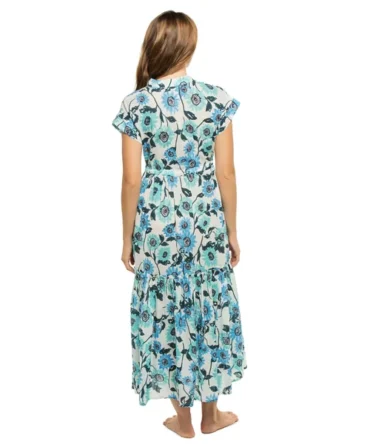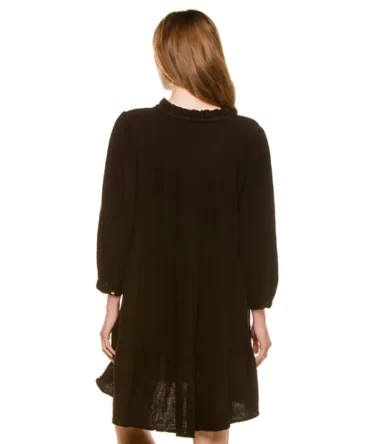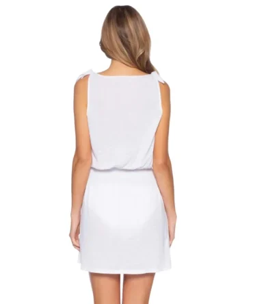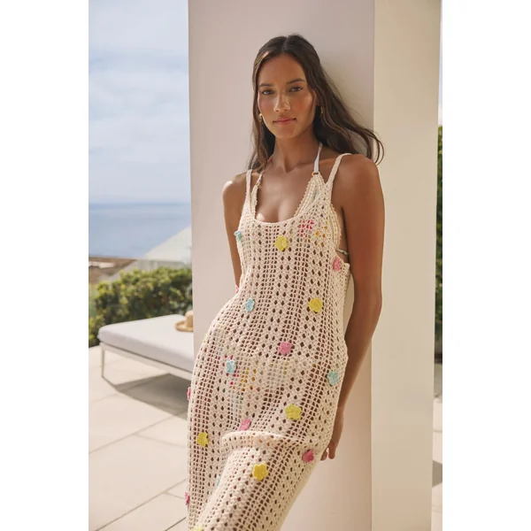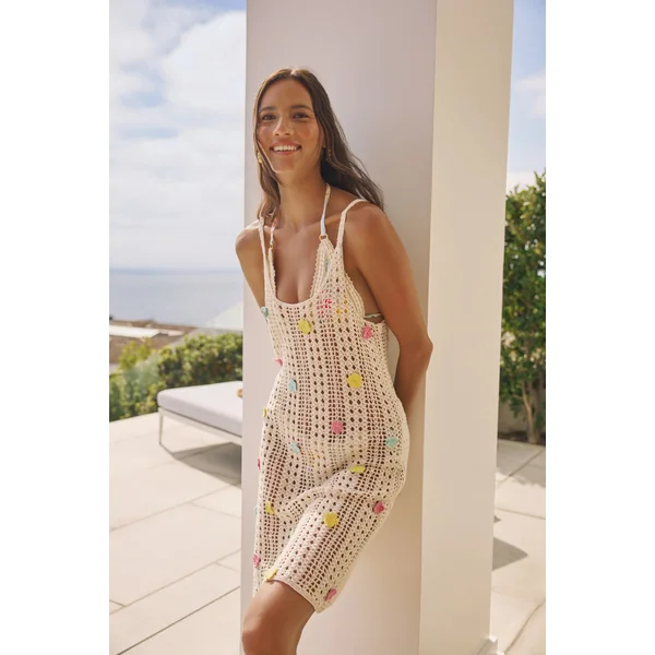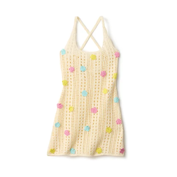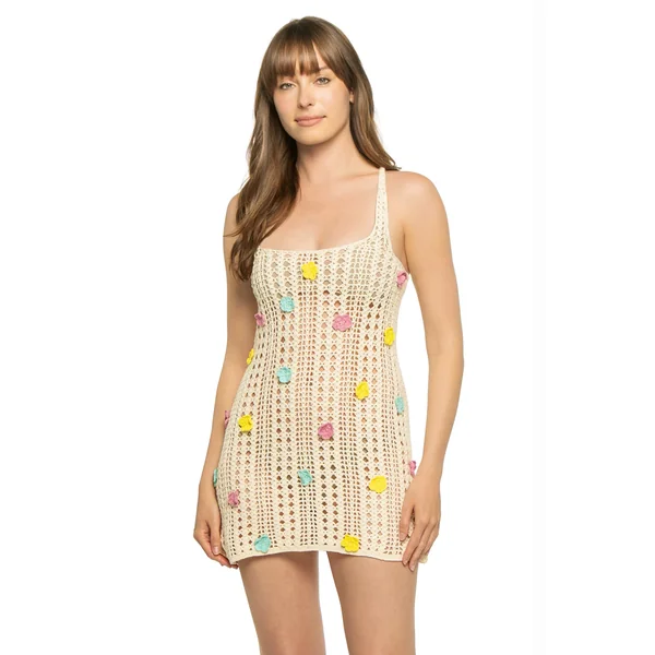 Crochet mini dress adorned with crochet florets and adjustable back tie.